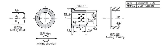 | JFB-1自润滑翻边轴套,结合了铜合金(ZCuZn24Al6)的耐磨性及固体润滑剂的自润滑性能,使其在使用过程中无需加油维护。产品被广泛用于高载、间歇性或摇摆运动,如汽机车生产流水线、水轮机、水库工作/事故门、塑胶机械等。根据使用的工况,可以提供各种类型的铜合金。 | JFB-1 标准公差尺寸