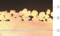 1. 改性聚四氟乙烯(PTFE)以及铅(Pb)的混合物 0.01-0.03mm,一种耐磨材料,运作过程中可形成转移膜,以保护对磨轴。 2. 铜粉层,0.20-0.3mm,提高PTFE/Pb与铜板层的结合强度,具有很好的承载能力和耐磨性。较高的导热系数可迅速转移运作过程产生的热量。 3. 铜基板0.7~2.3,提高轴承的承载能力和热传递,且有更好的耐腐蚀能力。